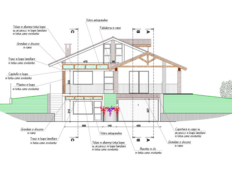 Al fine di inserire le pensiline di copertura nel progetto esistente, senza alterare l'equilibrio della facciata, sono state progettate delle strutture in travi di legno lamellare , su cui sono state posate due tipologie di coperture: una composta da coppi e l'altra da vetri antigrandine, entrambi studiate per armonizzarsi al meglio con l'edificio esistente.