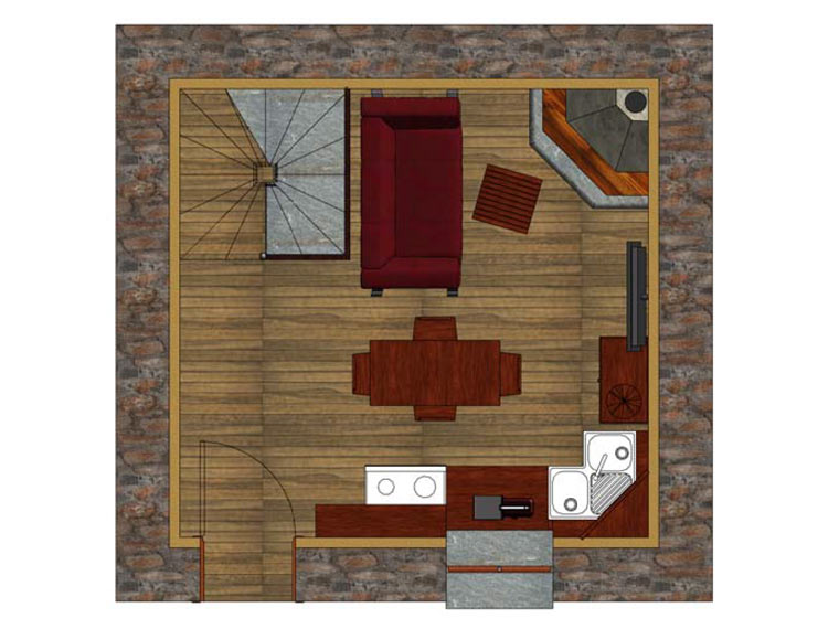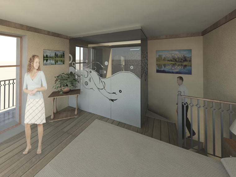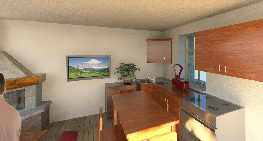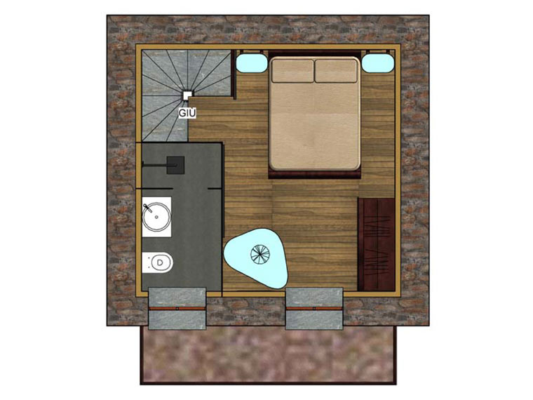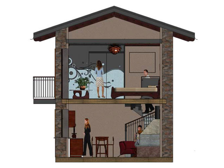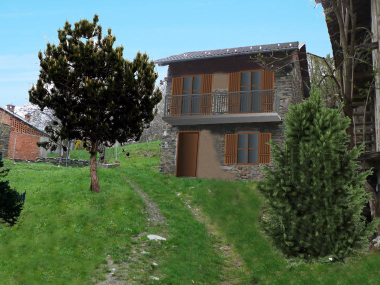 L'intervento riguarda la ristrutturazione di un rustico, sito in zona montana, per trasformarlo in un piccolo alloggio per la villeggiatura, da adibire principalmente a residenza secondaria. Il progetto riguarda la completa ristrutturazione degli spazi interni, lasciando pressoché immutato l'aspetto esteriore dell'immobile. La caratteristica peculiare del progetto è la realizzazione al piano primo di un bagno con pareti in vetro satinato serigrafato per non togliere luminosità agli ambienti.